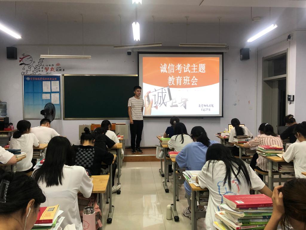临近期末考试周,为进一步贯彻落实学校考风考纪要求,深化学生的诚信理念,提升学生的诚信意识,培养诚信品质,让学生崇尚“诚信”,做到“不虚假”、“不欺瞒”,7月2日,商贸物流学院以班级为单位开展诚信考试主题班会。 班会伊始,各班班长将学校各项考试制度、违纪处理规定等悉数传达给同学们,并且呼吁同学们严格遵守考试制度,拒绝作弊行为。紧接着,班委们分享了身边因考试违纪被处分的鲜活范例,以此来告诫同学们严格要求自己,用实际行动营造商贸良好的学风、考风,同学们听后受益匪浅。 本次班会的召开,让同学们意识到了诚信应考的重要性,明白了不能有任何形式的作弊行为,懂得了应当以诚信的态度面对考试,要通过自己的努力付出来获得相应的回报。相信在即将到来的期末考试中,同学们一定能拿出积极饱满的态度,诚信应考,考出理想的成绩。