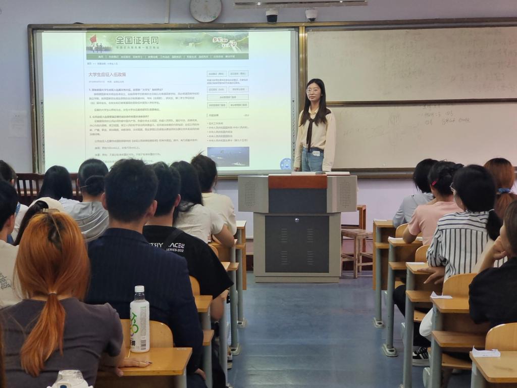 为进一步推进大学生征兵工作,激发大学生报效祖国的参军热情,引导大学生积极投身国防建设,学前教育学院于近日在J05楼203教室开展大学生征兵政策宣讲活动,活动由团学服务中心刘畅老师主讲,21、22级各班班长聆听了宣讲。 活动中,刘畅为同学们解读了最新的大学生入伍政策和具体要求,讲解了应征条件、征兵流程、优待政策等多方面的内容,并重点提出了大学生参军优势。她指出,高职大学生参军可免笔试升本、免本科学费,退伍后还有助学金,个人成长前景广阔。活动最后,刘畅鼓励同学们将个人梦想融入国家,参军入伍,报效祖国,用热血与青春书写无悔青春华章。 本次活动使同学们对大学生参军入伍政策了解地更加深入,爱国强军思想更加坚定,同时也为我院日后征兵工作顺利开展奠定了坚实的基础。