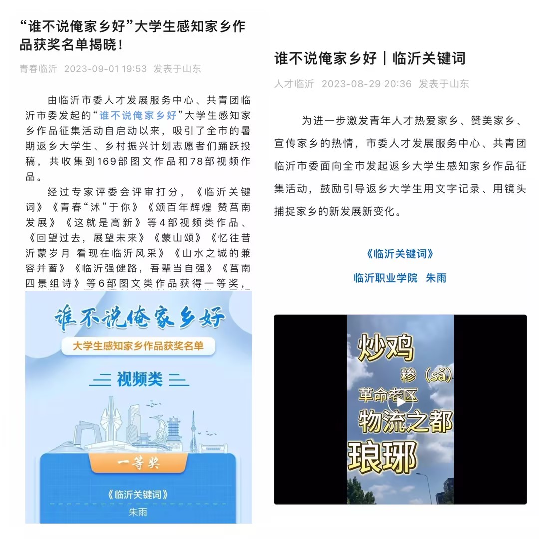 | 临职学子荣获临沂市“谁不说俺家乡好”大学生感知家乡作品征集活动一等奖 |
