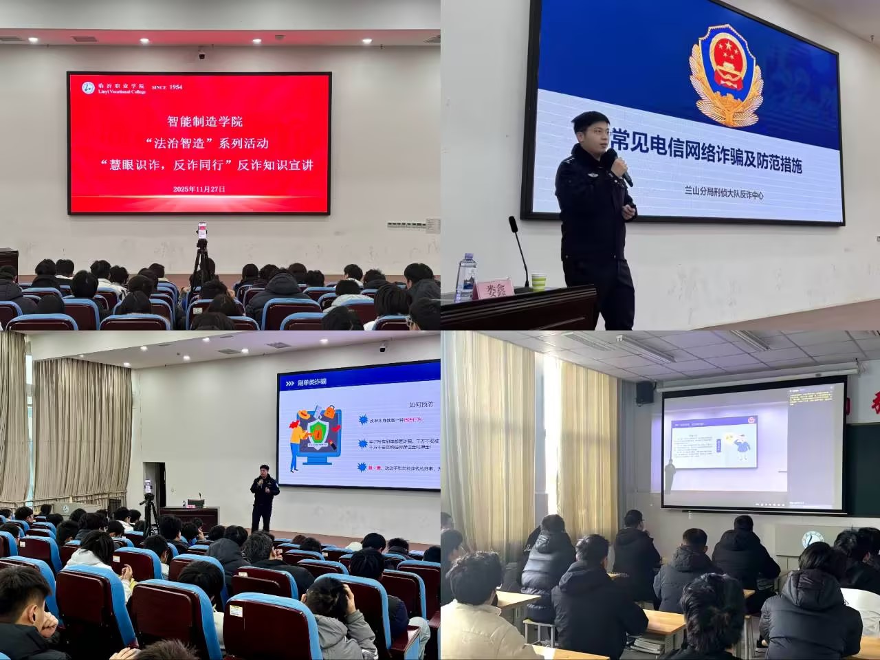 11月27日,智能制造学院组织开展“慧眼识诈,反诈同行”反诈宣讲活动,学院邀请临沂市公安局兰山分局刑侦大队,三级警长娄鑫主讲,全体学生通过线上与线下相结合的方式参与。 活动中,娄警官向学生们讲解了电信网络诈骗的常见类型和防范措施,紧密贴合大学生群体特点,围绕“刷单返利”、“冒充客服退款”、“虚假中奖”等高频诈骗场景,拆解诈骗分子的话术陷阱与作案流程,明确防范要点。 此次反诈宣讲活动,帮助学生掌握了实用的反诈技巧,为建设平安法治校园搭建了坚实平台。