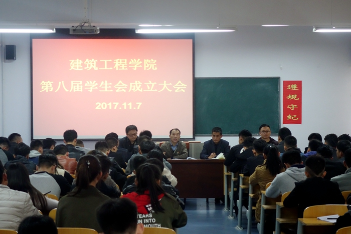 11月7日下午,建筑工程学院在教学楼四楼西合堂召开了第八届学生会成立大会。建工学院党总支副书记张洪忠、院长助理郭烽、主任助理刘宗亮、学生科科长于永超出席了此次会议。会议由刘宗亮主持。建筑工程学院第八届学生会全体成员及各班班长、团支书参会。 会议开始,于永超宣读第八届学生会成员名单,第七届学生会主席王超代表第七届学生会全体成员做了工作总结,第八届学生会主席王中立对新学期学生会工作做了具体规划,他用激昂慷慨演说词道出了第八届学生会全体成员为建工学院创造美好明天而拼搏奉献的激情和决心。 张洪忠书记在会上做了重要讲话,他肯定了第七届学生会所取得的成果并对第八届学生会的全体成员提出了殷切期盼,希望新一届学生会成员能够准确定位,明确自己的职责;同时也希望同学们能够正确的处理好学习与工作的关系,并提出了三个新任务:新时代、新使命、新征程;最后,刘宗亮对全体同学提出要培养三个意识:即服务意识、服从意识、创新意识,并告诫在场的每一位同学能够积极进取,踏实认真工作。 第八届学生会成立大会的召开是对新一届学生会成员精神上的一次极大的鼓舞,相信新一届学生会在学院领导的带领下,团结一心,工作上做到有特色、有风格、有成绩,齐心协力将建工学院建设的更加美好、更加强大。