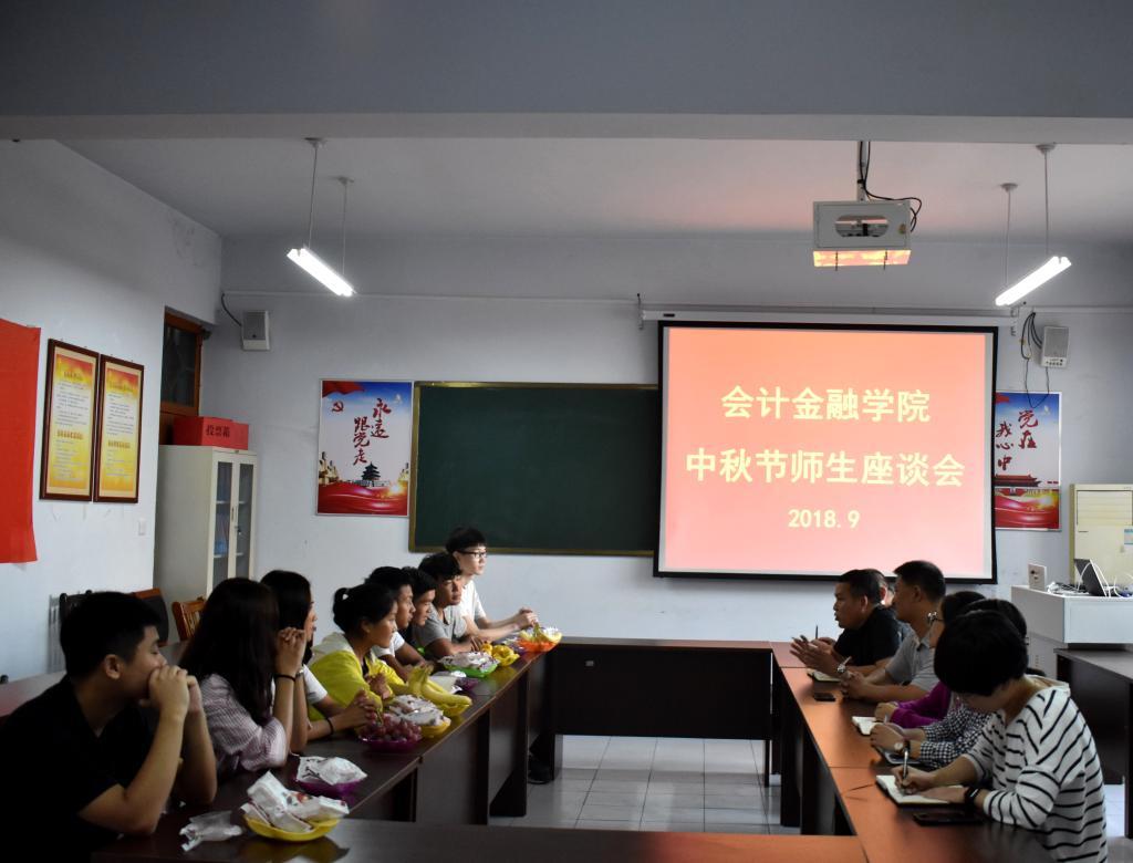 9月24日,迎来了我国一年一度的传统节日——中秋佳节,会计金融学院开展了“中秋大团圆,民族一家亲”的师生共度团圆节活动,使全体军训的新生和少数民族同学感受到家的温暖。 下午,在二楼会议室举行少数民族学生座谈会,党总支书记张传亮、全体辅导员老师以及在校的少数民族学生参加了座谈会。张书记代表学院向少数民族同学送上中秋佳节的祝福,对大家报考会计金融学院表示欢迎,并详细了解了大家的基本情况,希望同学们以后有问题及时找辅导员、班主任反馈,学院会帮助同学们一起解决各种困难,顺利完成大学学业。随后,师生共同交流,相互了解,气氛热烈而温馨。 晚上,2018级新生在教室内举行中秋联欢会,各班教室精心布置,节目形式丰富多彩,有让人捧腹的小品相声,有耳熟能详、引起大合唱的热门歌曲,有热情洋溢的舞蹈,同学们吃着象征团圆的月饼,在和谐、团结、有爱的氛围里,感受着节日的开心和快乐! 中秋大团圆,民族一家亲。不但让在外求学的同学们感受到了节日的气氛,更让同学们感受到来自会计金融学院这个大家庭的友爱和温暖。