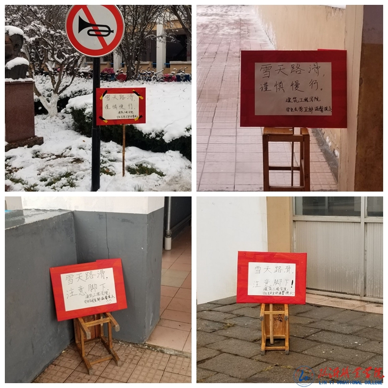 近日,冰雪天气增多,为配合学院冬季安全月活动开展,减少因雨雪、冰冻天气引起的意外事故的发生,保证我院师生员工的出行安全,建筑工程学院组织开展了制作、摆放“爱心小贴士”志愿活动。 活动开展期间,同学们认真调查了解了校园内意外事故多发地点和路段,为制作“爱心小贴士”警示牌做好了充分的准备。随后,同学们自己动手制作了足够数量的安全警示牌,分工合作,及时把这些写有“雪天路滑 注意脚下”的警示牌安插摆放到教学楼各个入口以及校园内醒目位置,以提醒师生注意出行安全。 此次活动的开展,不仅使同学们提高了奉献意识和责任意识,同时,也极大地减少了校园内雪天安全事故的发生,最大限度地保障了广大师生的人身安全,得到了大家的一致好评。