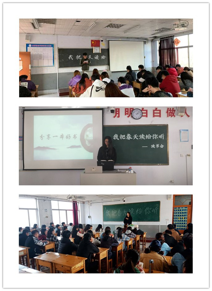 为引导学生礼敬文学经典,培养读书习惯,汲取书中营养,培育具有人文气质的一代青年,4月8日-4月9日商贸物流学院组织开展了“我把春天读给你听”读书分享活动。 春天正是读书学习最佳时节,伴春而读,与书为友,在书香中感受经典,享受春光。此次读书分享活动得到学生们的积极响应,大家纷纷诵经典、谈感受,采摘古今名篇佳作。本次活动分享书目内容题材广泛、纵横古今中外,既有《小雅·鹿鸣》、《将进酒》等古典诗词,又有《我们仨》、《陌上花开》等现代散文;既有《平凡的世界》、《穆斯林葬礼》等国内经典名著,又有《海底两万里》、《苏菲的世界》的外国文学瑰宝。一篇篇如歌如画的经典美文、一首首意味悠长的经典诗词在同学们或婉约、或豪放、或温婉多情、或铿锵有力的阅读分享中,个性与青春,梦想与激情展现的淋漓尽致。 各班读书分享活动圆满落幕,一名同学感慨道:“此次读书分享活动让自己受益匪浅,希望学校可以定期开展这样的活动,让大家有更多的机会分享交流。”本次活动展现了文学文字的独特魅力,激发了学生阅读热情,在全院掀起了一阵阅读风,进一步推动了书香商贸的建设。