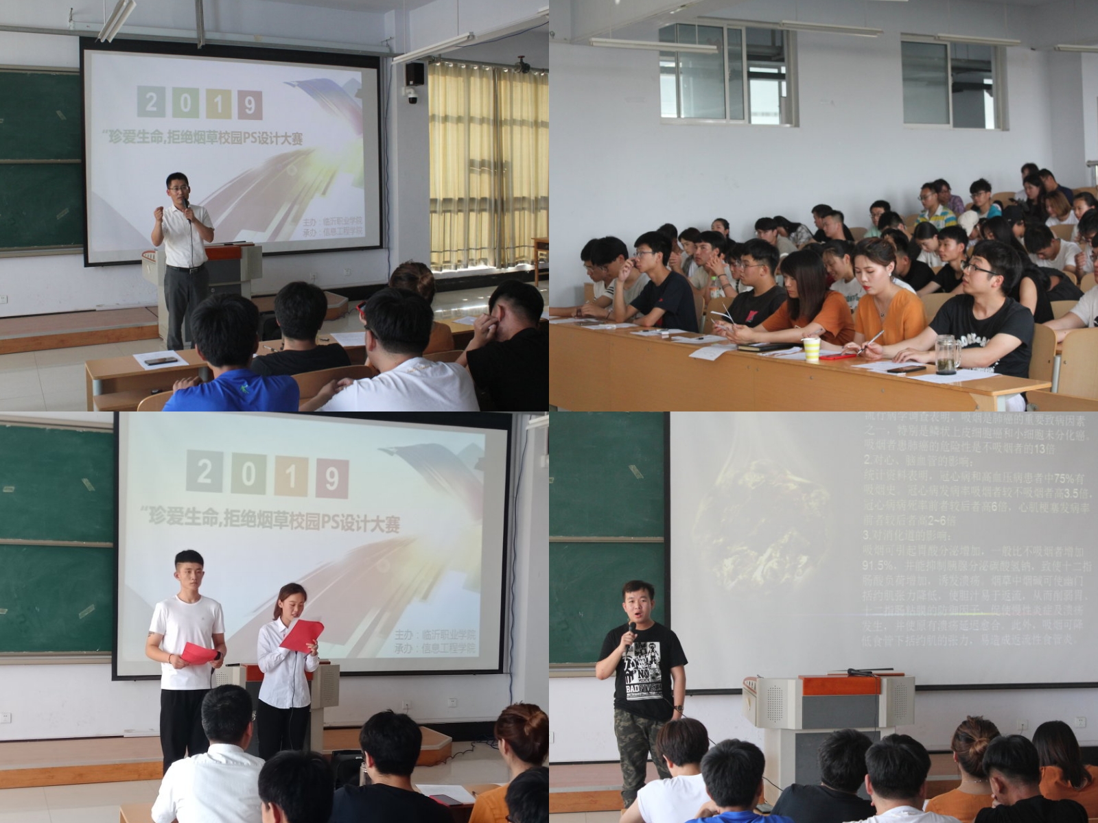 根据《第九届科技文化体育艺术节活动方案》,6月4日下午,临沂职业学院第九届校园科技文化体育艺术节之“珍爱生命,拒绝烟草”校园PS设计大赛决赛在J13教学楼六楼合堂教室举办。 在前期的充分动员下,经过院系推荐、院系初赛等环节,最终,共有十五名选手入围决赛。各二级学院参赛选手通过精心准备的设计PPT展示,让评委和同学们深入了解整个作品的构思、内涵、设计思路以及所运用的PS技巧。同时每个作品的独特的外观,新颖的结构,展现出选手的创新性思维,通过对比,视频,图片等详细数据让同学们深入了解到吸烟的危害。之后评委根据评分标准进行进行综合打分,最终“青烟常在,噩梦相随”“世界,禁烟日”“天使与魔鬼”等获得评委一致好评。 通过此次PS设计大赛,为同学们的发挥创意提供了展现的舞台,挖掘了同学们的创新思维及想象力,帮助同学们对更好地掌握PS技术,通过PS来提升同学们的专业成就感。并让同学们深刻认识到了吸烟的危害性,珍爱生命,拒绝烟草!