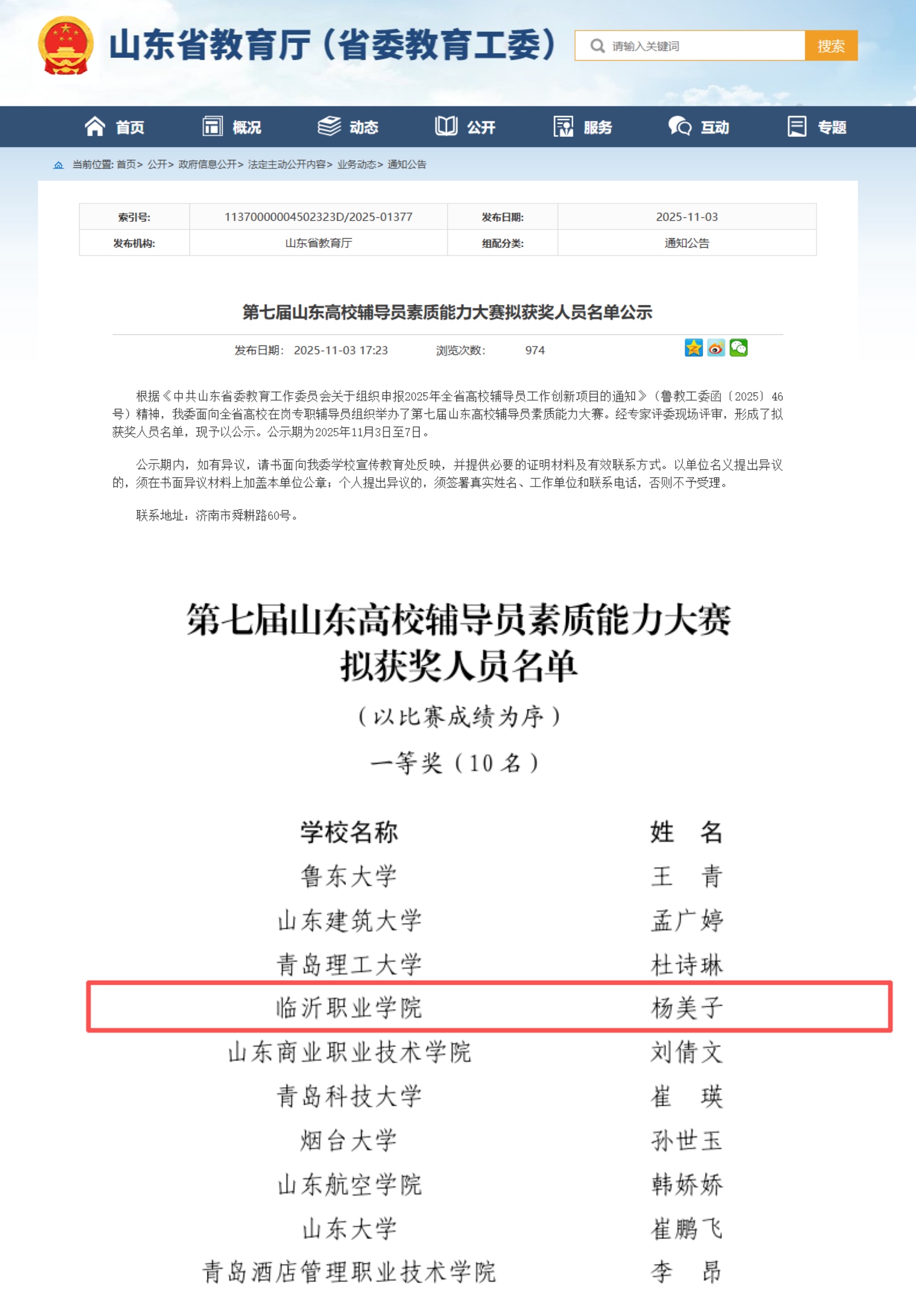 在刚刚落幕的第七届山东高校辅导员素质能力大赛中,我校辅导员杨美子凭借扎实的理论功底、过硬的职业能力与出色的现场表现,从全省179名参赛辅导员中脱颖而出,勇夺大赛一等奖,实现了我校在该项赛事上的新突破。 本届大赛由中共山东省委教育工委主办,山东高校思想政治工作创新发展中心(山东建筑大学)承办,旨在通过“以赛促学、以赛促建”机制,全面锤炼辅导员的专业能力与职业素养。比赛设置基础知识测试、理论宣讲、谈心谈话、案例研讨等环节,综合考察辅导员的政策理论水平、思想引领能力以及解决实际问题的本领。 近年来,学校党委高度重视专职辅导员队伍的专业化、职业化建设,持续完善培训体系,优化成长路径,畅通晋升渠道。通过实施辅导员能力提升计划、建设辅导员工作室、开展专题沙龙、进行创新项目评选等举措,系统推动辅导员队伍实现从“事务型”向“研究型”“引领型”转变。